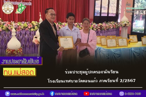ว่าที่ร้อยตรี ประเสริฐ ปวงละคร นายกเทศมนตรีนครแม่สอด มอบหมายให้ นายไกรสร กิจการ รองนายกเทศมนตรี พร้อมด้วย คณะผู้บริหาร สมาชิกสภาเทศบาล และเจ้าหน้าที่ที่เกี่ยวข้อง เข้าร่วมประชุมผู้ปกครองนักเรียนโรงเรียนเทศบาลวัดดอนแก้ว ภาคเรียนที่ 2 ปีการศึกษา 2567 โดยมี นางวาสนา เบ้านี รองผู้อำนวยการสถานศึกษา รักษาราชการในตำแหน่งผู้อำนวยการสถานศึกษา โรงเรียนเทศบาลวัดดอนแก้ว กล่าวรายงานถึงวัตถุประสงค์ เพื่อเปิดโอกาสให้ผู้ปกครองมีส่วนร่วมในการ จัดการศึกษาและวางแผนร่วมกันพัฒนากับทางโรงเรียน และให้ผู้ปกครองรับทราบนโยบาย กฎ ระเบียบข้อปฏิบัติของโรงเรียน