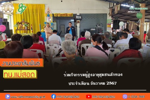 ว่าที่ร้อยตรี ประเสริฐ ปวงละคร นายกเทศมนตรีนครแม่สอด มอบหมายให้ นายไกรสร กิจการ รองนายกเทศมนตรี พร้อมด้วย รองประธานสภาเทศบาล ที่ปรึกษานายก สมาชิกสภาเทศบาล และเจ้าหน้าที่กองสาธารณสุขและสิ่งแวดล้อม เข้าร่วมการจัดกิจกรรมผู้สูงอายุชุมชนสักทอง โดยมีผู้อำนวยการกองสวัสดิการสังคมและเจ้าหน้าที่ทะเบียนราษฎร์ สำนักปลัดเทศบาล มาร่วมให้ความรู้ในครั้งนี้ด้วย