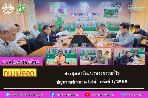 ว่าที่ร้อยตรี ประเสริฐ ปวงละคร นายกเทศมนตรีนครแม่สอด พร้อมด้วย คณะผู้บริหาร ประธานสภาฯ สมาชิกสภาเทศบาล รองปลัดเทศบาล ผู้อำนวยการกอง ฝ่ายป้องกันและบรรเทาสาธารณภัย เทศกิจเทศบาลนครแม่สอด และเจ้าหน้าที่ที่เกี่ยวข้อง ประชุมหารือแนวทางการแก้ไขปัญหารถจักรยานไฟฟ้าครั้งที่ 1/2568 เพื่อหารือปัญหาการใช้รถจักรยานไฟฟ้า และแนวทางการป้องกันแก้ไขและการควบคุมการใช้รถจักรยานไฟฟ้าเพื่อลดความเสี่ยงในการเกิดอุบัติเหตุบนถนนสาธารณะ ร่วมกับ สถานีตำรวจท่องเที่ยวตาก, สถานีตำรวจภูธรแม่สอด, สำนักงานขนส่งจังหวัดตาก สาขาอำเภอแม่สอด