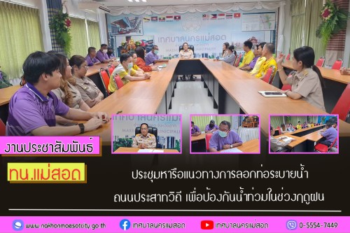 ว่าที่ร้อยตรี ประเสริฐ ปวงละคร นายกเทศมนตรีนครแม่สอด มอบหมายให้ นายไกรสร กิจการ รองนายกเทศมนตรีนครแม่สอด พร้อมด้วย นายประสาน มั่นมาก รองปลัดเทศบาลนครแม่สอด รักษาราชการแทนผู้อำนวยการกองช่างสุขาภิบาล และเจ้าหน้าที่กองช่างสุขาภิบาล ร่วมประชุมหารือแนวทางการลอกท่อระบายน้ำ ถนนประสาทวิถี เพื่อป้องกันน้ำท่วมในช่วงฤดูฝน รับมือฝนตกหนัก การเตรียมการลงพื้นที่ตรวจเยี่ยมของรัฐมนตรีช่วยว่าการกระทรวงมหาดไทย ในการตรวจงาน การบริหารจัดการขยะในพื้นที่ของเทศบาลนครแม่สอด และเรื่องการกวาดล้างทำความสะอาดบริเวณตลาดสดพาเจริญ