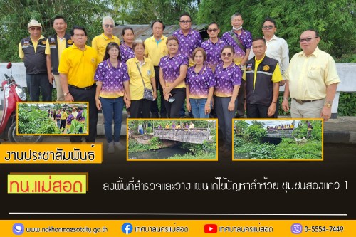 ว่าที่ร้อยตรี ประเสริฐ ปวงละคร นายกเทศมนตรีนครแม่สอด พร้อมด้วย คณะผู้บริหาร สมาชิกสภาเทศบาล ประธานชุมชนและคณะกรรมการชุมชนสองแคว 1 ลงพื้นที่สำรวจและวางแผนแก้ไข้ปัญหาลำห้วย ชุมชนสองแคว 1 เนื่องจากมีการบุกรุกก่อสร้างกีดขวางทางน้ำทำให้เกิดน้ำเน่าเสียและท่วมขัง พร้อมทั้งเร่งดำเนินการ ต่อไป
