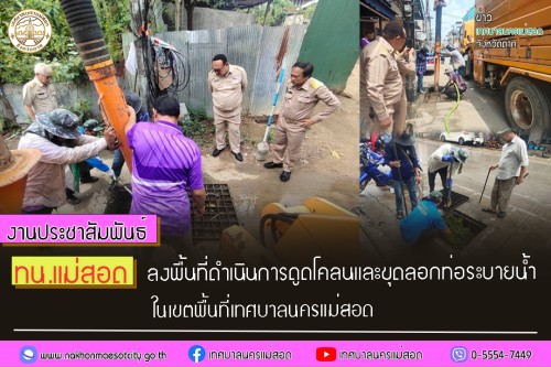 ว่าที่ร้อยตรีประเสริฐ ปวงละคร นายกเทศมนตรีนครแม่สอด พร้อมด้วย นายไกรสร กิจการ รองนายกเทศบาลนครแม่สอด คณะผู้บริหาร สมาชิกสภาเทศบาล นายประสาน มั่นมาก รองปลัดเทศบาลนครแม่สอด และเจ้าหน้าที่กองช่างสุขาภิบาล ลงพื้นที่ดำเนินการดูดโคลนและขุดลอกท่อระบายน้ำ ในเขตพื้นที่เทศบาลนครแม่สอด เพื่อให้การไหลของน้ำเสียสามารถระบายได้อย่างสะดวก รวดเร็ว รวมทั้งกำจัดกลิ่นเหม็น และสิ่งปฏิกูลต่าง ๆ เพื่อเตรียมพร้อมรองรับน้ำในฤดูฝน พร้อมขอความร่วมมือประชาชนในเขตเทศบาลนครแม่สอด ทิ้งขยะให้ถูกที่ไม่ทิ้งขยะลงพื้นเพราะขยะเป็นสาเหตุหนึ่งที่ทำให้ท่อระบายน้ำอุดตันได้