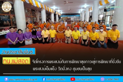 ว่าที่ร้อยตรีประเสริฐ ปวงละคร นายกเทศมนตรีนครแม่สอด เป็นประธานในการเปิดพิธีฯ พร้อมด้วย นายกรณพงศ์ คงปาน รองนายกเทศบาลนครแม่สอด คณะผู้บริหาร สมาชิกสภาเทศบาล นายเฉลิมเกียรติ ปัญญาสว่าง ผู้อำนวยการกองสาธารณสุขและสิ่งแวดล้อม และเจ้าหน้าที่คลินิกชุมชนอบอุ่น เข้าร่วมโครงการพระสงฆ์กับการพัฒนาสุขภาวะสู่การพัฒนาที่ยั่งยืน พระสงฆ์เข้มแข็ง วัดมั่นคง ชุมชนเป็นสุข ประจำปีงบประมาณ 2567 เพื่อการดูแลสุขภาพพระสงฆ์ รวมถึงเสริมสร้างทักษะการดำรงชีวิต การเรียนรู้พร้อมทั้งพัฒนาสุขภาวะ โดยบูรณาการการส่งเสริมสุขภาพและอนามัยสิ่งแวดล้อม ร่วมกับกิจกรรมวัดส่งเสริมสุขภาพ โดยมุ่งหวังให้เกิดการพัฒนา ระบบบริการด้านสุขภาพที่มีคุณภาพในการดูแลสุขภาพพระสงฆ์ และเป็นการพัฒนาเครือข่ายพระสงฆ์ ส่งผลให้คุณภาพชีวิตที่ดี มีสุขภาวะที่สมบูรณ์ทั้งทางกาย จิต ตลอดจนการจัดการสิ่งแวดล้อม ที่เอื้อต่อการมีสุขภาพดี