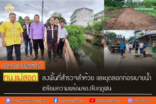 ว่าที่ร้อยตรี ประเสริฐ ปวงละคร นายกเทศมนตรีนครแม่สอด มอบหมายให้ นายไกรสร กิจการ และนายกรรณ กัณฑ์นิล รองนายกเทศมนตรีนครแม่สอด พร้อมด้วย คณะผู้บริหาร สมาชิกสภาเทศบาล เจ้าหน้าที่กองช่างสุขาภิบาล และเจ้าหน้าที่ที่เกี่ยวข้อง ลงพื้นที่สำรวจลำห้วยและติดตามความเรียบร้อยการดำเนินงานในเขตเทศบาลนครแม่สอดดังนี้