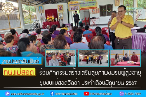 ว่าที่ร้อยตรี ประเสริฐ ปวงละคร นายกเทศมนตรีนครแม่สอด มอบหมายให้ นายไกรสร กิจการ รองนายกเทศมนตรีนครแม่สอด นายปรีชา เพชรปัญญา ที่ปรึกษานายกเทศมนตรี เจ้าหน้าที่กองสวัสดิการสังคม และชมรมผู้สูงอายุเทศบาลนครแม่สอด เข้าร่วมกิจกรรมสร้างเสริมสุขภาพชมรมผู้สูงอายุ ชุมชนแม่สอดวิลล่า ประจำเดือนมิถุนายน 2567 เพื่อเปิดโอกาสให้ผู้สูงอายุในชุมชนได้แลกเปลี่ยนความคิดเห็น และทำกิจกรรมร่วมกัน