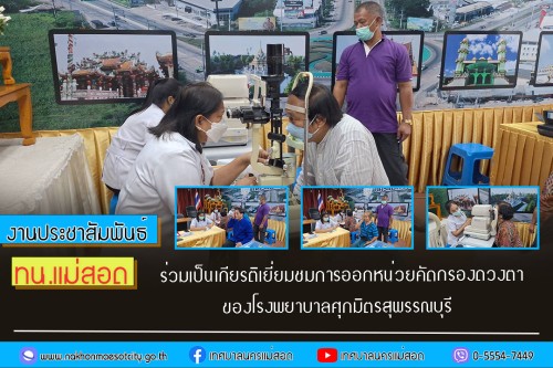 ว่าที่ร้อยตรี ประเสริฐ ปวงละคร นายกเทศมนตรีนครแม่สอด พร้อมด้วย คณะผู้บริหาร สมาชิกสภาเทศบาล ประชาชนในพื้นที่ และเจ้าหน้าที่ที่เกี่ยวข้อง ร่วมรับการตรวจคัดกรอง โรคต้อกระจก จากหน่วยคัดกรองดวงตาโรงพยาบาลศุภมิตรสุพรรณบุรี เพื่อให้การตรวจติดตามเป็นไปอย่างต่อเนื่อง รวมทั้งการตรวจคัดกรองให้กับผู้ที่ยังไม่มีโอกาสมารับบริการ