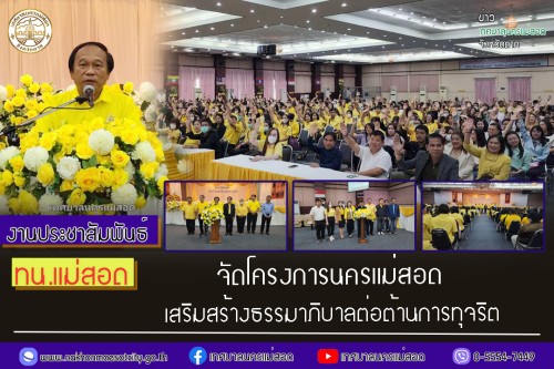 ว่าที่ร้อยตรี ประเสริฐ ปวงละคร นายกเทศมนตรีนครแม่สอด เป็นประธานกล่าวเปิดโครงการนครแม่สอดเสริมสร้างธรรมาภิบาลต่อต้านการทุจริต พร้อมด้วย คณะผู้บริหาร สมาชิกสภาเทศบาล ปลัดเทศบาล รองปลัดเทศบาล ผู้อำนวยการกอง ข้าราชการ และพนักงานเทศบาล ผู้อำนวยการสถานศึกษาโรงเรียนในสังกัดเทศบาลนครแม่สอด ครู และบุคลากรทางการศึกษา เข้าร่วมโครงการฯ