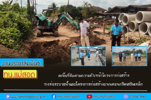 ว่าที่ร้อยตรี ประเสริฐ ปวงละคร นายกเทศมนตรีนครแม่สอด มอบหมายให้ นายกรรณ กัณฑ์นิล รองนายกเทศมนตรีนครแม่สอด พร้อมด้วย คณะผู้บริหาร และสมาชิกสภาเทศบาล ลงพื้นที่ติดตามความคืบหน้าโครงการก่อสร้างวางท่อระบายน้ำและโครงการก่อสร้างถนนคอนกรีตเสริมเหล็ก ชุมชนมณีไพรสณฑ์และชุมชนสองแคว 2