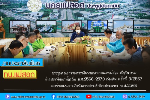 ว่าที่ร้อยตรี ประเสริฐ ปวงละคร นายกเทศมนตรีนครแม่สอด พร้อมด้วย คณะผู้บริหาร ผู้อำนวยการกองฯ หัวหน้าส่วนราชการ คณะกรรมการสนับสนุนแผนพัฒนาฯ และเจ้าหน้าที่ที่เกี่ยวข้อง เข้าร่วมการประชุมคณะกรรมการพัฒนาเทศบาลนครแม่สอด เพื่อพิจารณา ร่างแผนพัฒนาท้องถิ่น พ.ศ.2566-2570 เพิ่มเติม ครั้งที่ 3/2567 และร่างแผนการดำเนินงานประจำปีงบประมาณ พ.ศ.2568