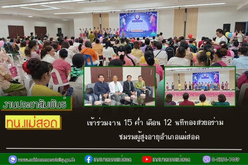 ว่าที่ร้อยตรี ประเสริฐ ปวงละคร นายกเทศมนตรีนครแม่สอด มอบหมายให้ นายกรรณ กัณฑ์นิล รองนายกเทศมนตรี พร้อมด้วย คณะผู้บริหาร สมาชิกสภาเทศบาล และเจ้าหน้าที่ที่เกี่ยวข้อง เข้าร่วมงาน 15 ค่ำ เดือน 12 นทีทองสวยอร่าม ชมรมผู้สูงอายุอำเภอแม่สอด ได้จัดการประกวดนางนพมาศ ผู้สูงวัยขึ้น เพื่อให้ผู้สูงอายุได้แสดงความสามารถ กระตุ้น ส่งเสริม สนับสนุน ให้ผู้สูงอายุได้มีกิจกรรมที่ส่งเสริมทั้งสุขภาพกายและใจ ตลอดจนเป็นการสร้างความสามัคคีในกลุ่มผู้สูงอายุ