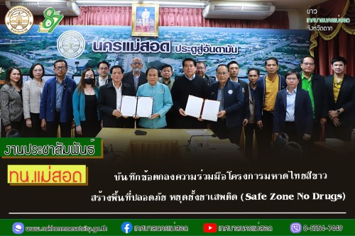 ว่าที่ร้อยตรี ประเสริฐ ปวงละคร นายกเทศมนตรีนครแม่สอด เป็นประธานฯ พร้อมด้วย คณะผู้บริหาร รองปลัดเทศบาล ผู้อำนวยการกอง ผู้อำนวยการสถานศึกษาในสังกัดเทศบาล หัวหน้าส่วนราชการ และเจ้าหน้าที่ที่เกี่ยวข้องเข้าร่วมบันทึกข้อตกลงความร่วมมือโครงการมหาดไทยสีขาว สร้างพื้นที่ปลอดภัย หยุดยั้งยาเสพติด (Safe Zone No Drugs) เพื่อร่วมมือกันกำหนดมาตรการป้องกันยาเสพติดของข้าราชการ พนักงาน ลูกจ้าง และบุคลากรในสังกัดเทศบาลนครแม่สอด