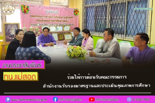 ว่าที่ร้อยตรี ประเสริฐ ปวงละคร นายกเทศมนตรีนครแม่สอด มอบหมายให้ นายกรณพงศ์ คงปาน รองนายกเทศมนตรี พร้อมด้วย สมาชิกสภาเทศบาล และคณะกรรมการสถานศึกษาศูนย์พัฒนาเด็กเล็กโรงเรียนเทศบาลวัดมณีไพรสณฑ์ ร่วมให้การต้อนรับคณะกรรมการสำนักงานรับรองมาตรฐานและประเมินคุณภาพการศึกษา