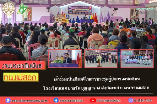 ว่าที่ร้อยตรี ประเสริฐ ปวงละคร นายกเทศมนตรีนครแม่สอด มอบหมายให้ นายกรณพงศ์ คงปาน รองนายกเทศมนตรี พร้อมด้วย นายบรรจง มาคง ประธานสภาเทศบาล ที่ปรึกษานายกและสมาชิกสภาเทศบาลนครแม่สอดเข้าร่วมเป็นเกียรติในการประชุมผู้ปกครองนักเรียนโรงเรียนเทศบาลวัดบุญญาวาส สังกัดเทศบาลนครแม่สอด