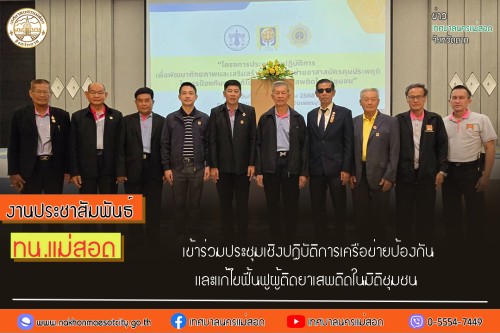 โดย เทศบาลนครแม่สอด ได้มอบหมาย ว่าที่พันตรี ดร.ไพฑูรย์ ปริญญาธรรมกุล ผู้อำนวยการกองยุทธศาสตร์และงบประมาณ เข้าร่วมประชุมเชิงปฏิบัติการเครือข่ายป้องกันและแก้ไขฟื้นฟูผู้ติดยาเสพติดในมิติชุมชน โดยมี พันตำรวจตรี สุริยา สิงหกมล อธิบดีกรมคุมประพฤติ เป็นประธานพิธีเปิดโครงการ พร้อมบรรยายพิเศษ มีสมาชิกเครือข่ายทั่วประเทศเข้าร่วมประชุม กว่า 120 คน