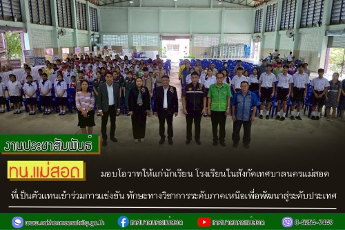 โดยมี นายกุล เครือวีระ นายกเทศมนตรีนครแม่สอด พร้อมด้วย คณะผู้บริหาร สมาชิกสภาเทศบาล ผู้อำนวยการกองการศึกษา และเจ้าหน้าที่ที่เกี่ยวข้อง ร่วมมอบโอวาทให้แก่นักเรียน โรงเรียนเทศบาลวัดชุมพลคีรี โรงเรียนเทศบาลเฉลิมพระเกียรติสมเด็จพระเทพรัตนราชสุดา ฯ สยามบรมราชกุมารี และโรงเรียนกีฬาเทศบาลนครแม่สอด ที่เป็นตัวแทนเข้าร่วมการแข่งขันทักษะทางวิชาการระดับภาคเหนือเพื่อพัฒนาสู่ระดับประเทศ