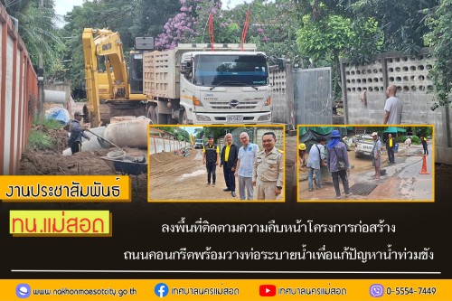 โดย นายกุล เครือวีระ นายกเทศมนตรีนครแม่สอด มอบหมายให้ นายวสุธร บุญมาก รองนายกเทศมนตรีนครแม่สอด พร้อมด้วย สมาชิกสภาเทศบาลนครแม่สอด และที่ปรึกษากิตติมศักดิ์ ลงพื้นที่ติดตามความคืบหน้าโครงการก่อสร้างถนนคอนกรีตพร้อมวางท่อระบายน้ำเพื่อแก้ปัญหาน้ำท่วมขัง