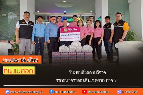 โดย นายกุล เครือวีระ นายกเทศมนตรีนครแม่สอด มอบหมายให้ นายวสุธร บุญมาก รองนายกเทศมนตรี พร้อมด้วย นายจิรวัฒน์ มงคลจุฑาเศรษฐ รองนายกเทศมนตรี คณะผู้บริหาร สมาชิกสภาเทศบาล และเจ้าหน้าที่ฝ่ายป้องกันและบรรเทาสาธารณภัยเทศบาลนครแม่สอด รับมอบสิ่งของบริจาค จากธนาคารออมสินเขตตาก ภาค 7 เพื่อนำไป ช่วยเหลือประชาชนที่ประสบอุทกภัยจากพายุวิภา ในเขตพื้นที่เทศบาลนครแม่สอด