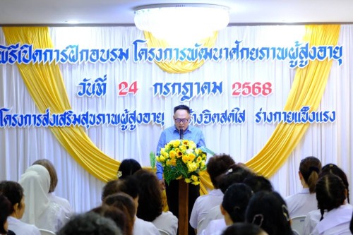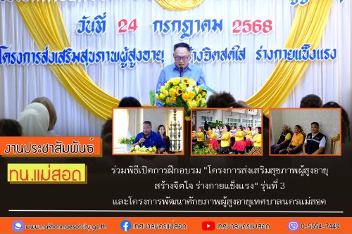 โดย นายกุล เครือวีระ นายกเทศมนตรีนครแม่สอด มอบหมายให้ นายจิรวัฒน์ มงคลจุฑาเศรษฐ รองนายกเทศมนตรีนครแม่สอด เป็นประธานในพิธีฯ พร้อมด้วย คณะผู้บริหาร สมาชิกสภาเทศบาล นายประสาน มั่นมาก รองปลัดเทศบาล รักษาราชการแทน ปลัดเทศบาลนครแม่สอด ผู้อำนวยการกอง หัวหน้าส่วนราชการ และเจ้าหน้าที่ที่เกี่ยวข้อง เข้าร่วมพิธีเปิดการฝึกอบรม "โครงการส่งเสริมสุขภาพผู้สูงอายุ สร้างจิตใจ ร่างกายแข็งแรง" รุ่นที่ 3 และโครงการพัฒนาศักยภาพผู้สูงอายุเทศบาลนครแม่สอด