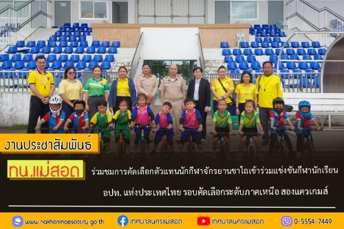 โดยนายกุล เครือวีระ นายกเทศมนตรีนครแม่สอด มอบหมายให้ นายธีรรัตน์ ใจโปร่ง รองนายกเทศมนตรีนครแม่สอด พร้อมด้วยเจ้าหน้าที่กองการศึกษา คณะครูและนักเรียนในสังกัดเทศบาลนครแม่สอด ร่วมชมการคัดเลือก ตัวแทนนักกีฬาจักรยานขาไถ เข้าร่วมแข่งขันกีฬานักเรียน อปท. แห่งประเทศไทย รอบคัดเลือกระดับภาคเหนือ สองแควเกมส์ คัดเลือกนักเรียนในระดับปฐมวัยจากสังกัดเทศบาลนครแม่สอด ได้แก่ โรงเรียนเทศบาลวัดบุญญาวาส โรงเรียนเทศบาลวัดมณีไพรสรณ์ โรงเรียนเทศบาลวัดชุมพลคีรี และโรงเรียนเทศบาลวัดดอนแก้ว