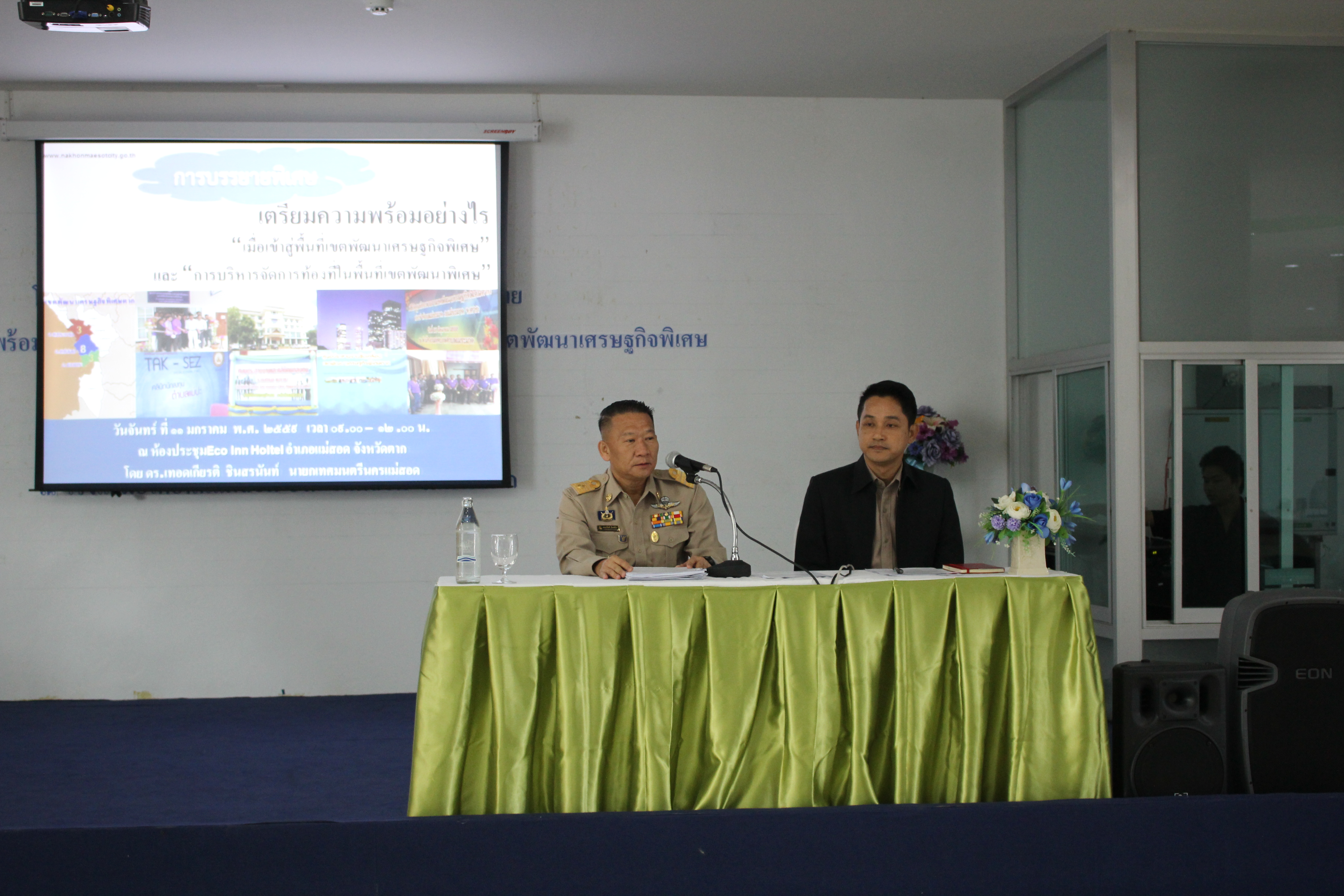 เมื่อเวลา9.30น.นายกเทศมนตรีนครแม่สอด นายเทอดเกียรติ ชินสรนันท์ และผู้อำนวยการกองวิชาการและแผนงาน ร่วมบรรยายเขตเศรษฐกิจพิเศษและท้องถิ่นรูปแบบพิเศษแก่คณะศึกษาดูงานเทศบาลเมืองหนองคาย