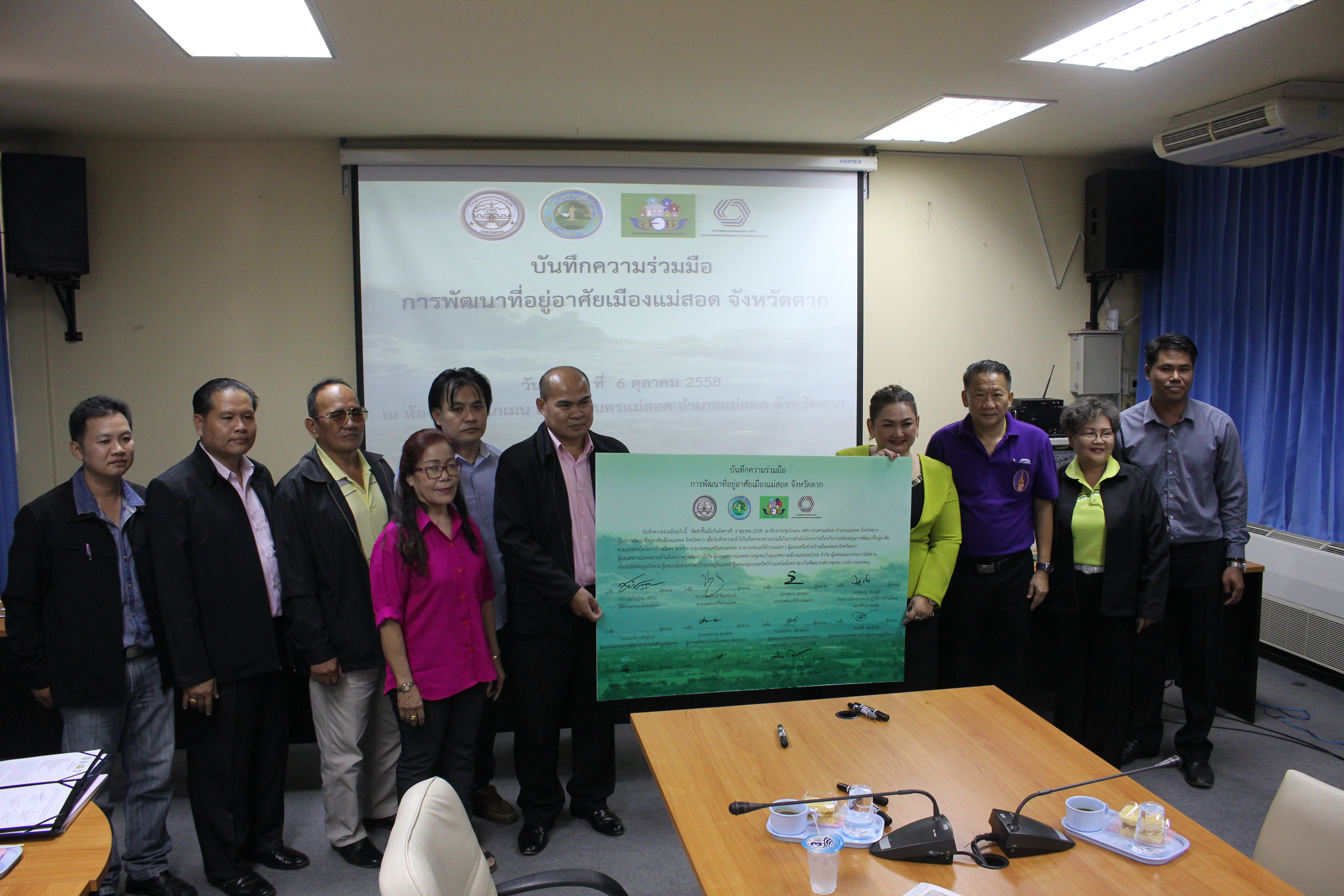 ดร.เทอดเกียรติ ชินสรนันท์ นายกเทศมนตรีนครแม่สอด เข้าร่วมการบันทึกความร่วมมือ การพัฒนาที่อยู่อาศัยเมืองแม่สอด จังหวัดตาก วันอังคารที่ ๖ ตุลาคม พ.ศ. ๒๕๕๘ ณ ห้องประชุมโกเมน เทศบาลนครแม่สอด