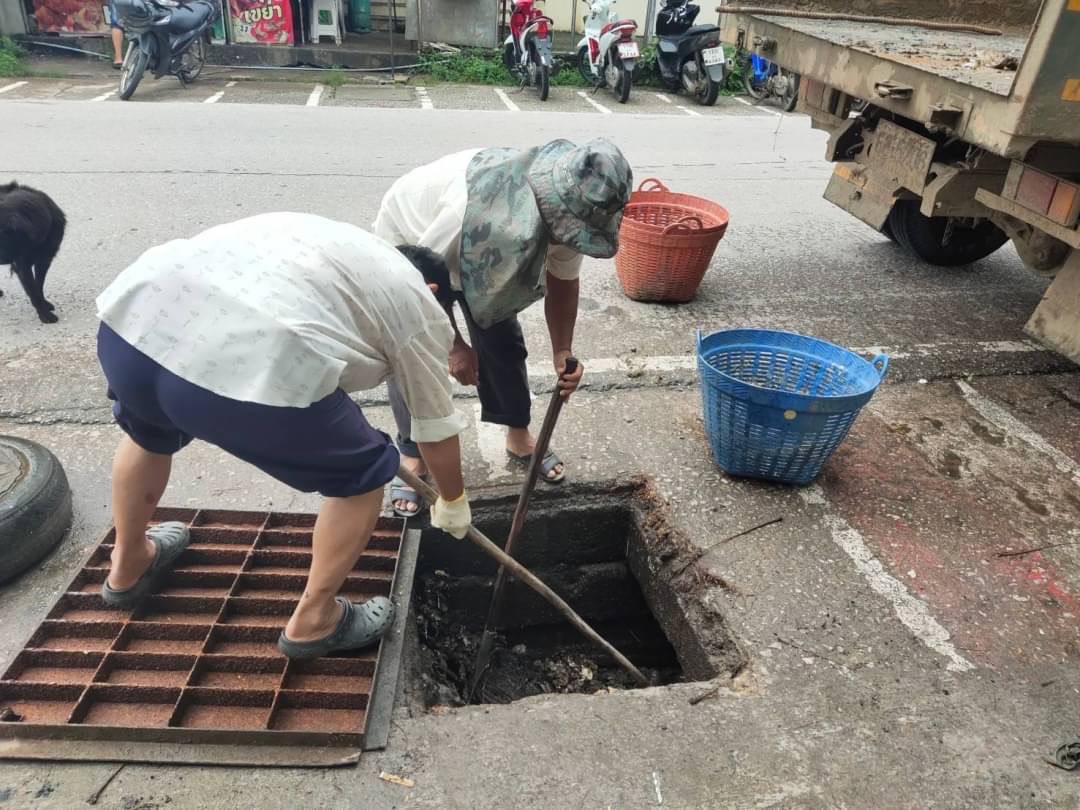 1. เจ้าหน้าที่ภาคสนามกองช่างสุขาภิบาล เข้าดำเนินการทะลวงท่อระบายน้ำ ตักเศษขยะตะแกรงกั้นขยะจุดโลตัสเล็ก