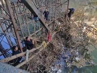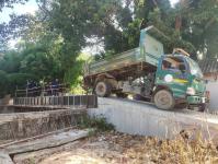 เข้าดำเนินการเก็บเศษกิ่งไม้ วัชพืชและขยะ ที่ติดคานสะพานไม้ (งานก่อสร้างสะพาน)