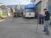 เจ้าหน้าที่ภาคสนามกองช่างสุขาภิบาล เข้าดำเนินการลงสารน้ำ EM ที่เพาะเชื้อแล้ว