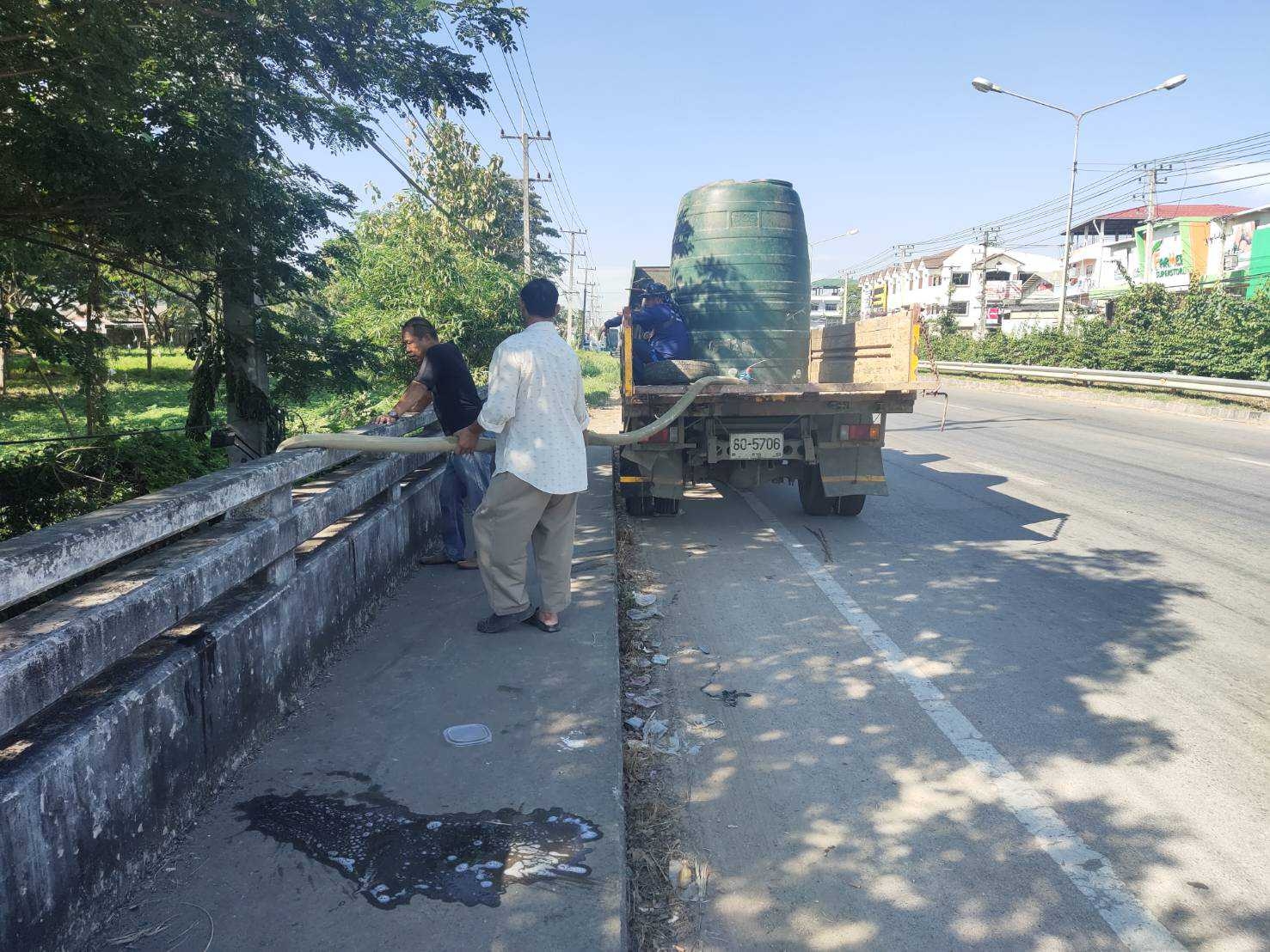 เจ้าหน้าที่ภาคสนามกองช่างสุขาภิบาล เข้าดำเนินการลงสารน้ำ EM ที่เพาะเชื้อแล้ว จำนวน 2,000 ลิตร ลงลำห้วยสาธารณะ