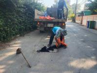 เข้าดำเนินการลงยางมะตอยฝาท่อระบายน้ำทรุดตัว บริเวณถนนสรรพการ (สายบ้านสวนดาบพร)