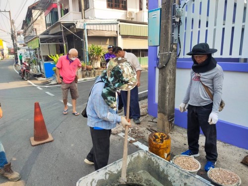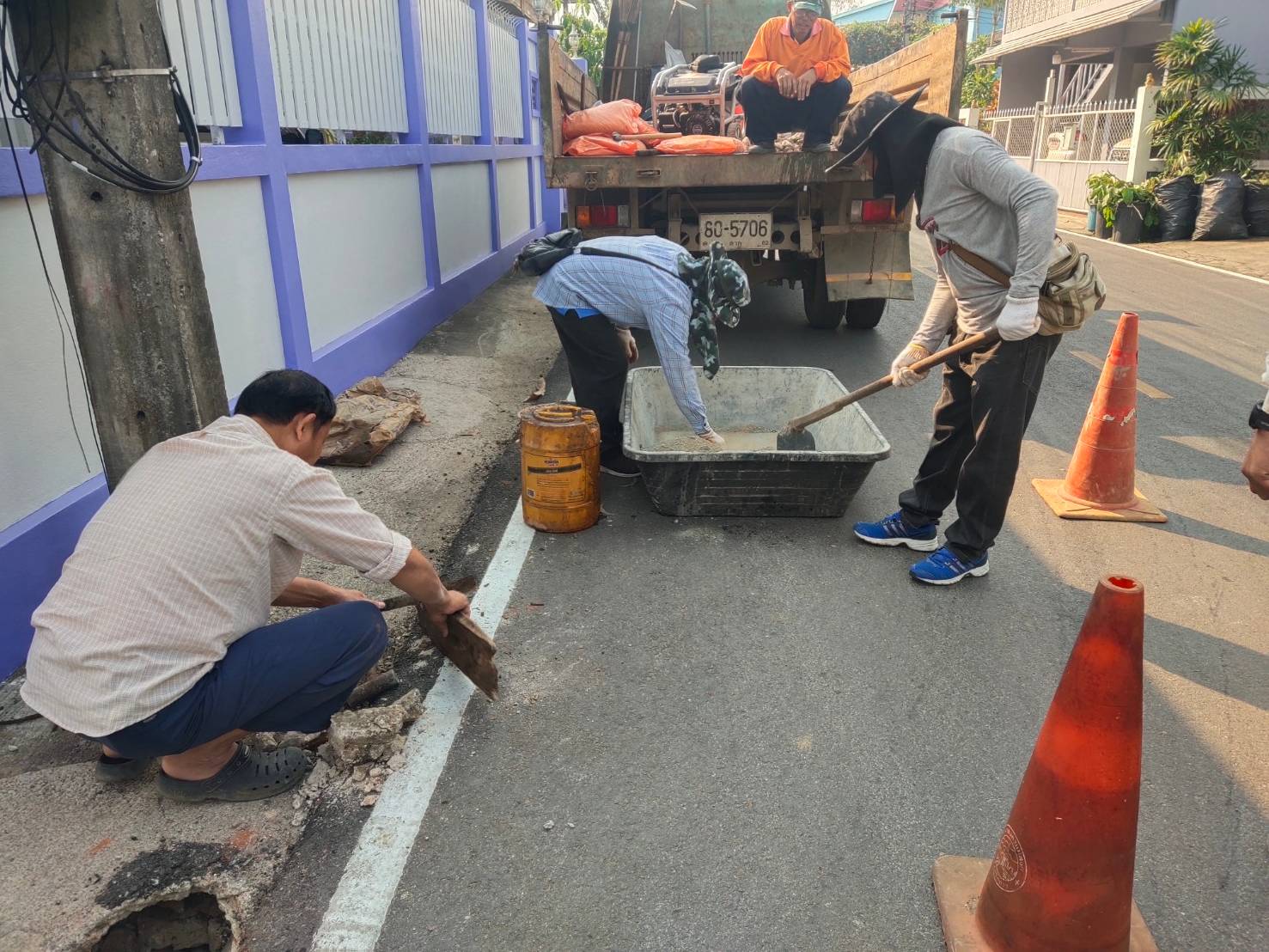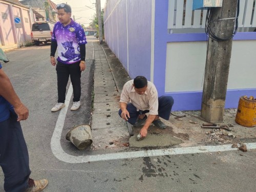 1. เจ้าหน้าที่ภาคสนามกองช่างสุขาภิบาล เข้าดำเนินการเทปูนอุดโพรง ขอบฝาท่อระบายน้ำ (รางยู)