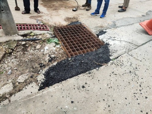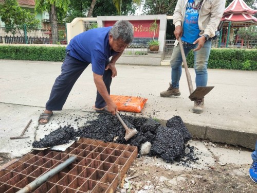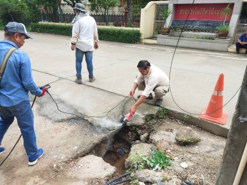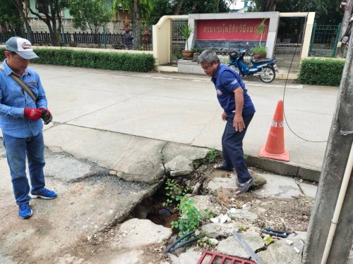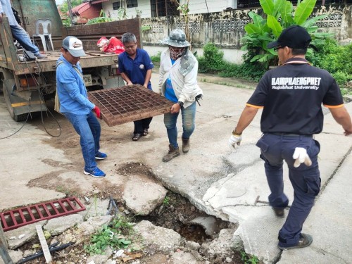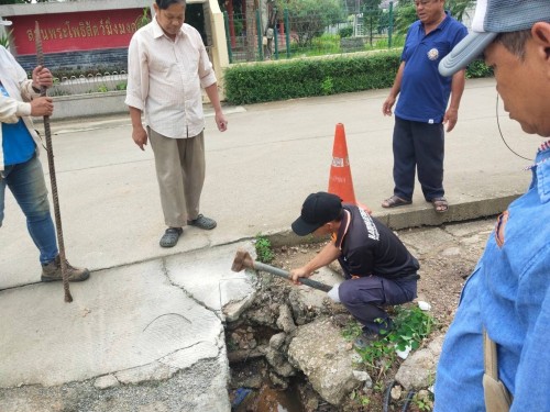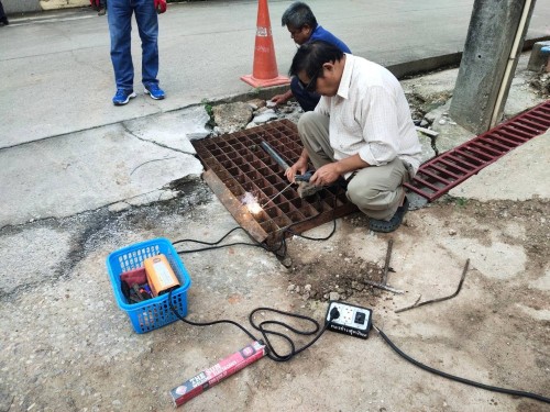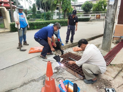 เข้าดำเนินการซ่อมแซมฝาท่อระบายน้ำ บริเวณชุมชมสองแคว 1 สามแยกศาลเจ้าแม่กวนอิม
