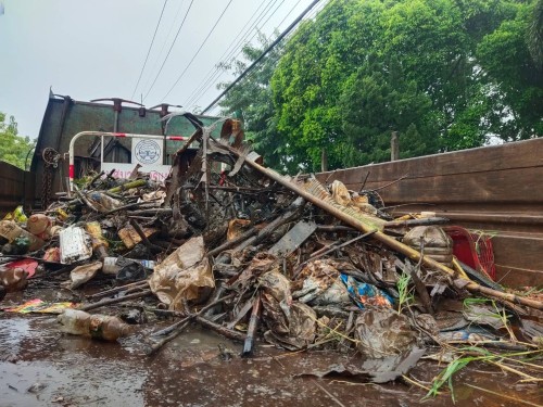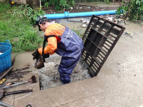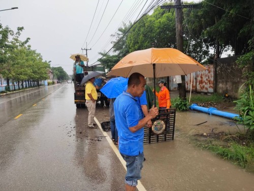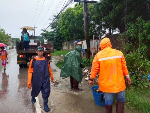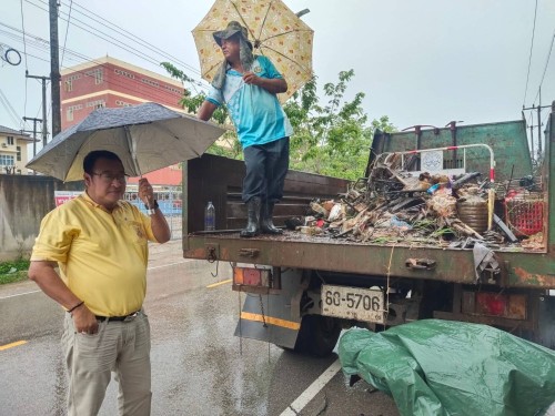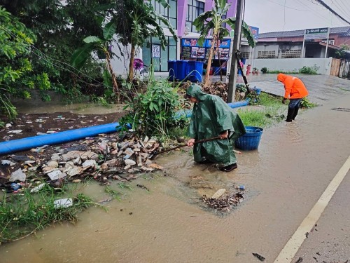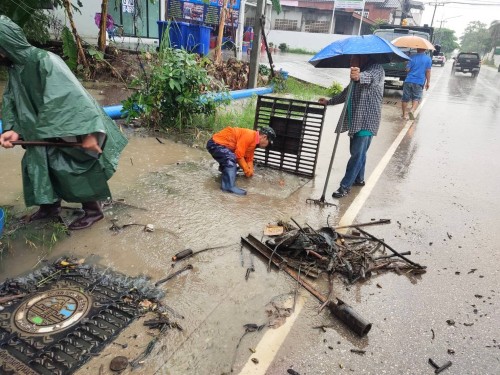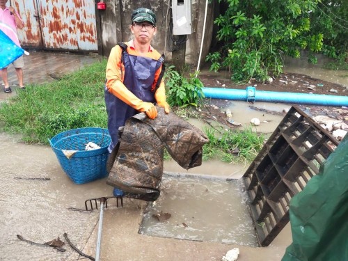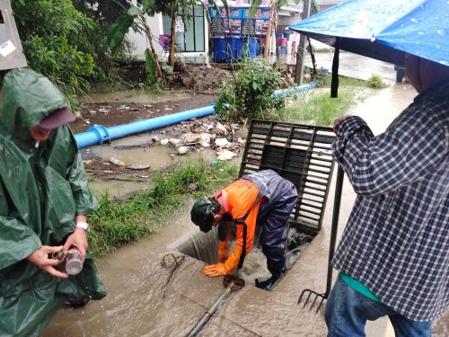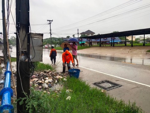 เข้าดำเนินการกำจัดเศษขยะและวัชพืชปากท่อระบายน้ำ บริเวณคลองหน้าโรงเรียนราษฎร์วิทยา (ตี่มิ้ง)