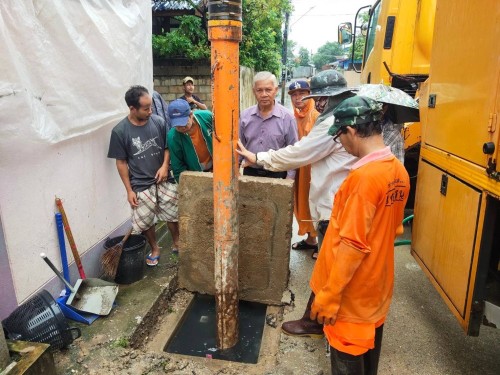 เข้าดำเนินการเปิดฝาท่อระบายน้ำเพื่อดูดน้ำออกและหาระยะความลึกของท่อ ทิศทางการไหลขอน้ำภายในท่อ
