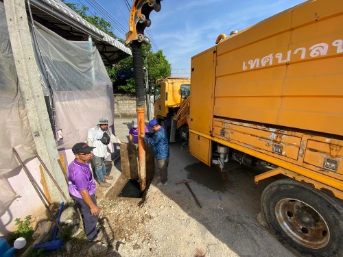 พนักงานภาคสนามกองช่างสุขาภิบาลนำรถดูดโคลน บริเวณซอยมะเท ตรงข้ามโรงเรียนแม่สอด
