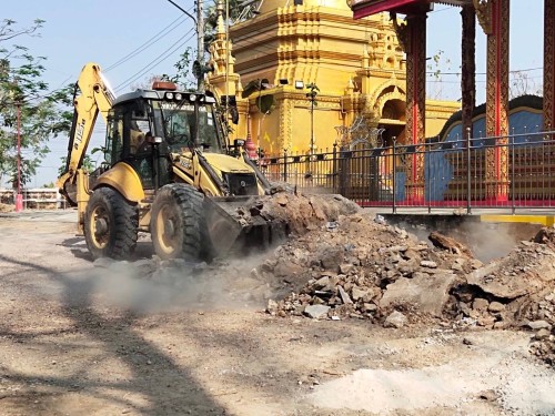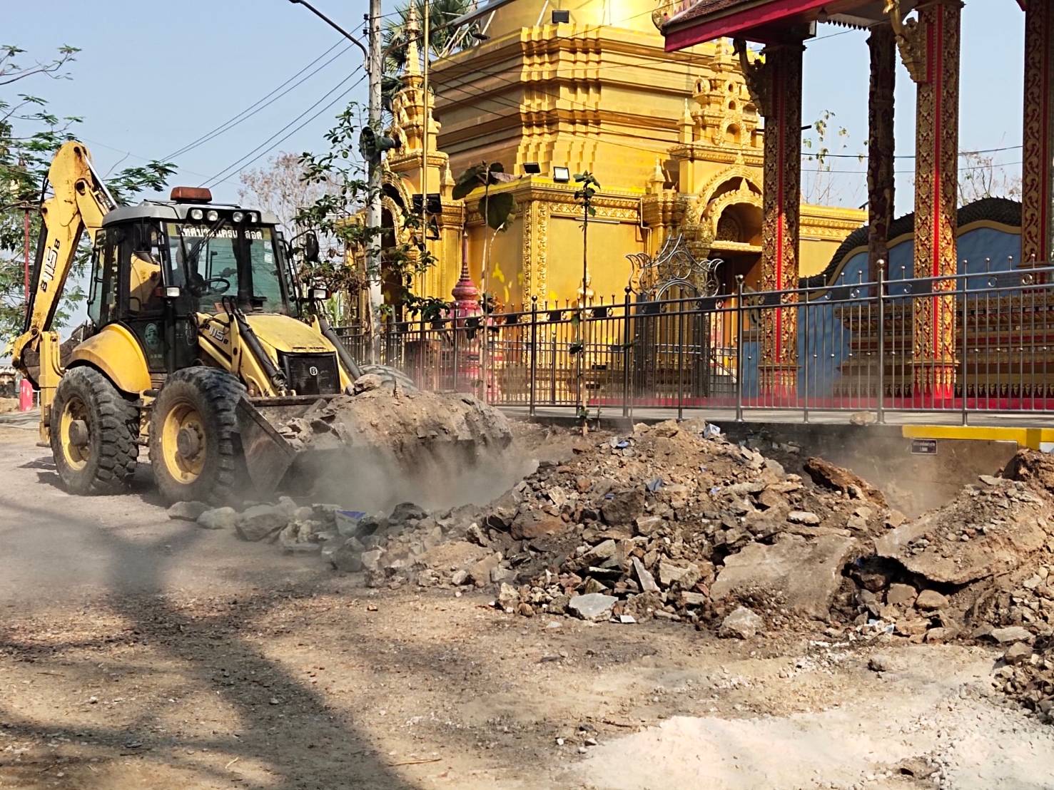 นำรถตักฯ พร้อมรถบรรทุก 6 ล้อ ตักเศษหิน,วัสดุก่อสร้าง ภายในวัดสักทอง