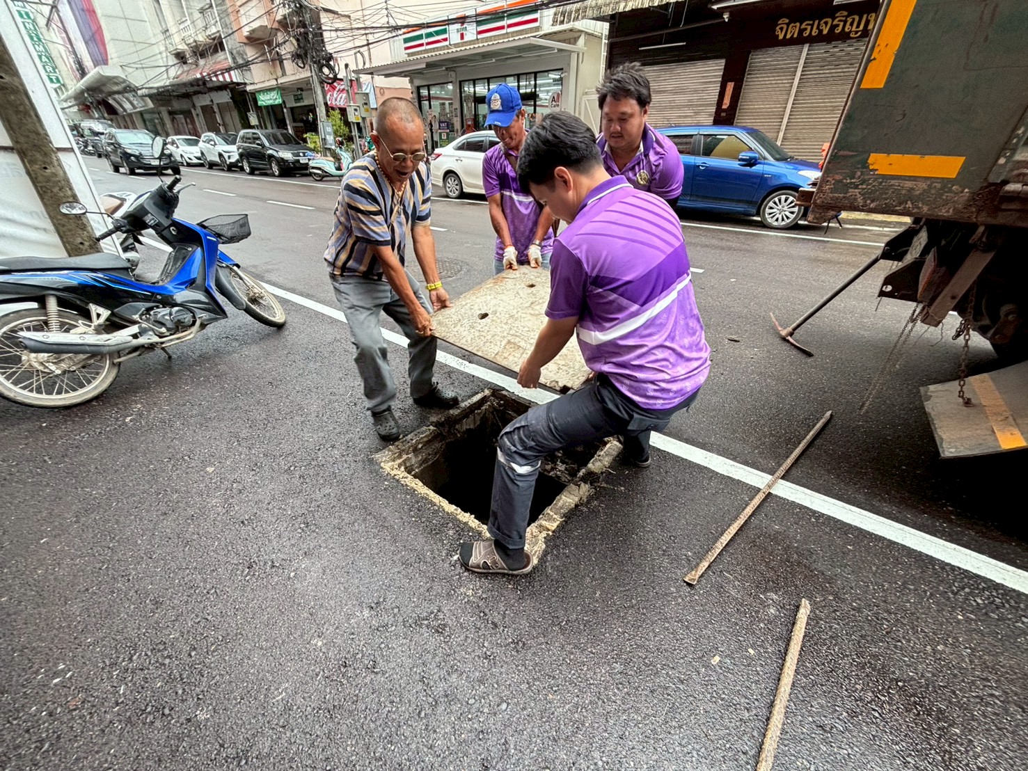 2. ได้เข้าดำเนินการเปลี่ยนฝาท่อระบายน้ำ บริเวณตรงข้ามร้านเซเว่นใกล้กับฮงล้ง จำนวน 2 ฝา