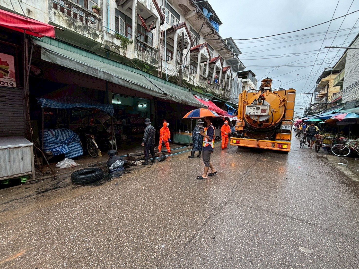 ได้เข้าดำเนินการดูดโคลนลอกท่อระบายน้ำ บริเวณตลาดพาเจริญ