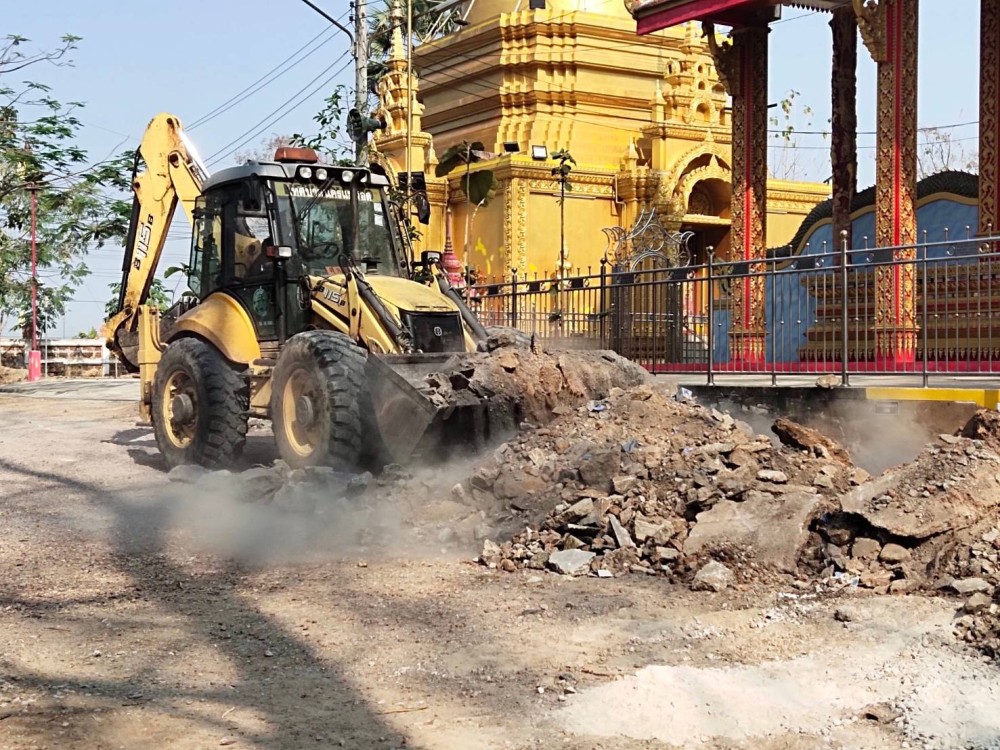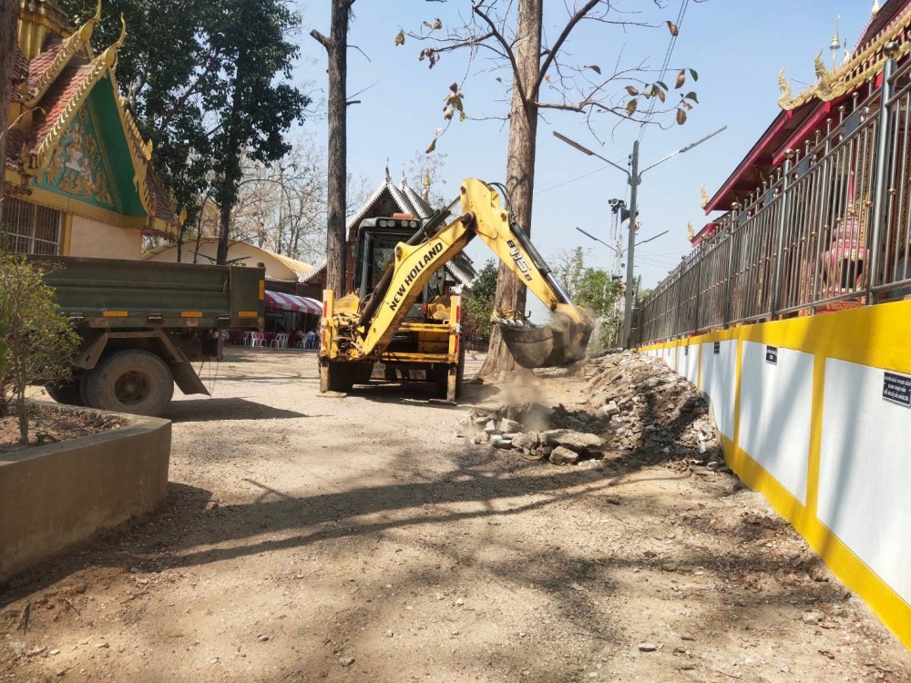 นำรถตักฯ พร้อมรถบรรทุก 6 ล้อ ตักเศษหินและวัสดุก่อสร้าง ภายในวัดสักทอง