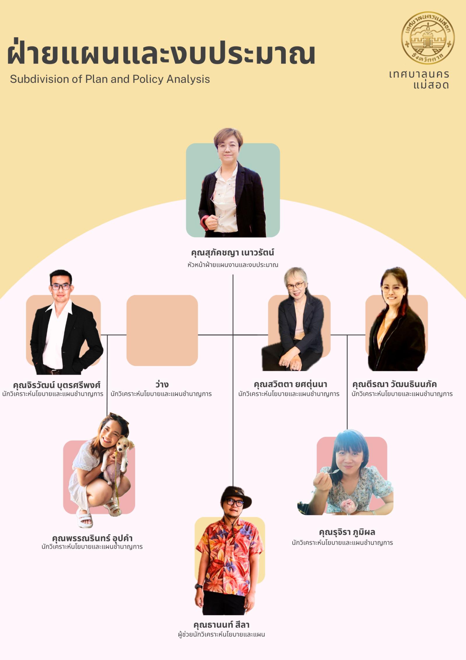ฝ่ายแผนงานและงบประมาณมี นางสาวสุภัคชญา เนาวรัตน์ หัวหน้าฝ่ายแผนงานและงบประมาณ เป็นผู้บังคับบัญชาพนักงานและลูกจ้างปฏิบัติงานในฐานะหัวหน้างาน ปฏิบัติงานในฐานะหัวหน้าหน่วยงานระดับกองในองค์กรปกครองส่วนท้องถิ่น ขนาดเล็กหรือในฐานะหัวหน้าฝ่าย ที่มีลักษณะงานเกี่ยวกับการวางแผน บริหารจัดการจัดระบบงาน อำนวยการ สั่งราชการ มอบหมาย กำกับ แนะนำ ตรวจสอบ ประเมินผลงาน ตัดสินใจแก้ปัญหาในงานของหน่วยงานที่รับผิดชอบซึ่งมีลักษณะหน้าที่ความรับผิดชอบและคุณภาพของงานสูง และปฏิบัติงานอื่นตามที่ได้รับมอบหมาย