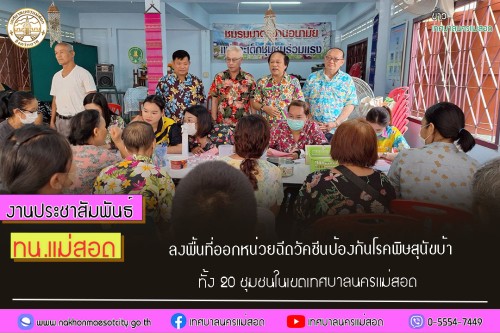 ว่าที่ร้อยตรี ประเสริฐ ปวงละคร นายกเทศมนตรีนครแม่สอด พร้อมด้วย คณะผู้บริหาร ผอ.กองสาธารณสุขและสิ่งแวดล้อม และเจ้าหน้าที่ที่เกี่ยวข้อง ลงพื้นที่ในการออกหน่วยฉีดวัคซีนป้องกันโรคพิษสุนัขบ้าให้กับสุนัขและแมว พร้อมรับลงทะเบียนสัตว์เลี้ยงที่อยู่ในเขตเทศบาลนครแม่สอด โดยเจ้าของสามารถนำสัตว์เลี้ยง สุนัขและแมว มารับวัคซีน และขึ้นทะเบียนสัตว์เลี้ยงได้ โดยจะให้บริการทั้ง 20 ชุมชนในเขตเทศบาลนครแม่สอด ตามวันและเวลาที่กำหนด