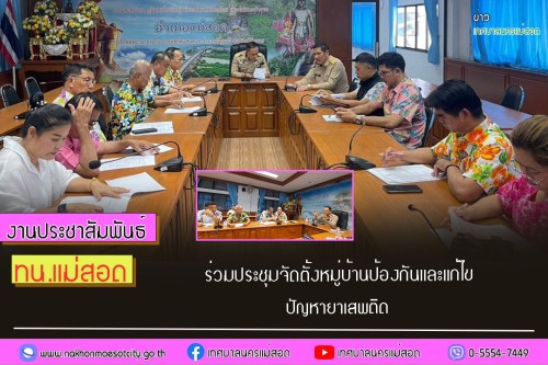 ว่าที่ร้อยตรี ประเสริฐ ปวงละคร นายกเทศมนตรีนครแม่สอด มอบหมายให้ นายไกรสร กิจการ รองนายกเทศมนตรีนครแม่สอด พร้อมด้วย นายเสกสรร ศรีรมย์ นักจัดการงานทั่วไปชำนาญการ นายสยาม มั่นเมือง นักจัดการงานทั่วไปชำนาญการ และเจ้าหน้าที่ที่เกี่ยวข้อง ร่วมประชุมจัดตั้งหมู่บ้านป้องกันและแก้ไขปัญหายาเสพติด โดยกองทุนแม่ของแผ่นดินตามนโยบายกระทรวงมหาดไทย ที่ได้มอบหมายให้อำเภอแม่สอดประสานการขับเคลื่อนแก้ไขปัญหายาเสพติดให้ครอบคลุมทุกพื้นที่ที่ยังไม่ได้ดำเนินการ เพื่อขับเคลื่อนขยายผลกิจกรรมดังกล่าว และเพื่อเตรียมพร้อมการเป็นหมู่บ้านต้นกล้ากองทุนแม่ของแผ่นดินในปีถัดไป โดยมีนายสัญญา เพชรเศษ นายอำเภอแม่สอด เป็นประธานการประชุมในครั้งนี้