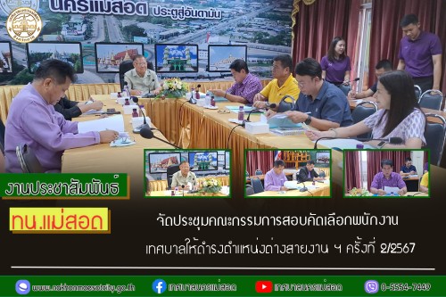 นายอุทัย ปัญญาสว่าง ผู้ทรงคุณวุฒิใน ก.ท.จ.ตาก เป็นประธานการประชุม ฯ พร้อมด้วยคณะกรรมการ ฯ ร่วมประชุมคณะกรรมการสอบคัดเลือกพนักงานเทศบาลให้ดำรงตำแหน่งต่างสายงาน จากตำแหน่งสายงานประเภททั่วไป ให้ดำรงตำแหน่งสายงานประเภทวิชาการ ตำแหน่งนักป้องกันและบรรเทาสาธารณภัย ระดับปฏิบัติการ ครั้งที่ 2/2567 เพื่อประชุมพิจารณาร่างประกาศเทศบาลนครแม่สอด เรื่อง รายชื่อผู้มีสิทธิสอบ, พิจารณาร่างประกาศกำหนดวัน เวลา สถานที่สอบ และระเบียบเกี่ยวกับการสอบคัดเลือกฯ และการแต่งตั้งคณะกรรมการออกข้อสอบภาคความรู้ความสามารถทั่วไป (ภาค ก) ภาคความรู้ความสามารถที่ใช้เฉพาะสำหรับตำแหน่ง (ภาค ข), คณะกรรมการการผลิตข้อสอบ, คณะกรรมการเก็บรักษาข้อสอบและกระดาษคำตอบ, คณะกรรมการคุมสอบและจัดสถานที่สอบ, คณะกรรมการตรวจข้อสอบกรอกคะแนนและรวบรวมคะแนน และคณะกรรมการสอบสัมภาษณ์