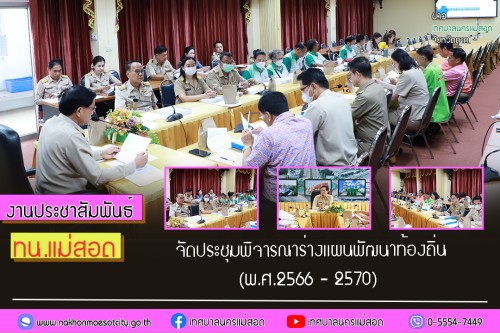 ว่าที่ร้อยตรี ประเสริฐ ปวงละคร นายกเทศมนตรีนครแม่สอด มอบหมายให้ นายกรณพงศ์ คงปาน รองนายกเทศมนตรี เป็นประธานการประชุมฯ พร้อมด้วย นายไกรสร กิจการ รองนายกเทศมนตรี และคณะกรรมการ เข้าร่วมการประชุมพิจารณาร่างแผนพัฒนาท้องถิ่น (พ.ศ.2566 – 2570)