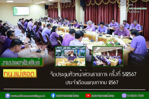 ว่าที่ร้อยตรี ประเสริฐ ปวงละคร นายกเทศมนตรีนครแม่สอด เป็นประธานการประชุม พร้อมด้วย คณะผู้บริหาร สมาชิกสภาเทศบาล ปลัดเทศบาล รองปลัดเทศบาล ผู้อำนวยการกอง หัวหน้าส่วนราชการ ผู้อำนวยการสถานศึกษาในสังกัดเทศบาล และเจ้าหน้าที่ที่เกี่ยวข้อง เข้าร่วมการประชุมหัวหน้าส่วนราชการ ครั้งที่ 5/2567 ประจำเดือน พฤษภาคม 2567 เพื่อให้ส่วนราชการได้รายงานผลการปฏิบัติราชการที่ผ่านมา รายงานความคืบหน้าและแผนการดำเนินงาน เผยแพร่ข้อมูล ข่าวสาร หนังสือสั่งการระเบียบปฏิบัติต่าง ๆ ข้อหารือของส่วนราชการแต่ละส่วน เพื่อหาแนวทางร่วมกันพร้อมให้ความคิดเห็นในทางที่เป็นประโยชน์ต่อการบริหารงานของเทศบาลนครแม่สอด