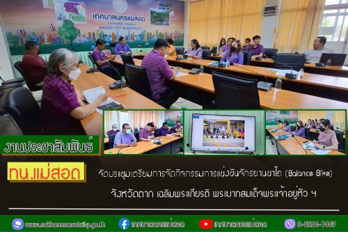 เวลา 13.00 น. ว่าที่ร้อยตรี ประเสริฐ ปวงละคร นายกเทศมนตรีนครแม่สอด พร้อมด้วย คณะผู้บริหาร ประธานสภาเทศบาลนครแม่สอด ปลัดเทศบาล รองปลัดเทศบาล หัวหน้าส่วนราชการ กองการศึกษา เจ้าหน้าที่ส่งเสริมการปกครองท้องถิ่น จังหวัดตาก และหน่วยงานที่เกี่ยวข้อง เข้าร่วมประชุมเตรียมการจัดกิจกรรมการแข่งขันจักรยานขาไถ (Balance Bike) จังหวัดตาก เฉลิมพระเกียรติพระบาทสมเด็จพระเจ้าอยู่หัว เนื่องในโอกาสพระราชพิธีมหามงคลเฉลิมพระชนมพรรษา 6 รอบ 28 กรกฎาคม 2567