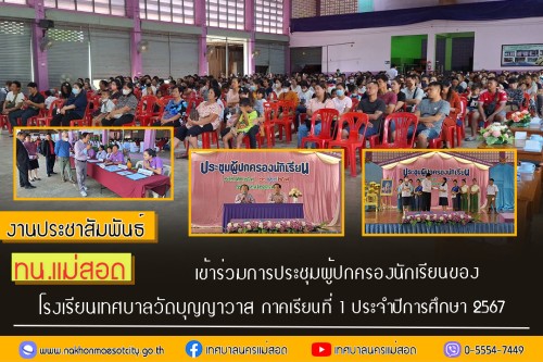 ว่าที่ร้อยตรี ประเสริฐ ปวงละคร นายกเทศมนตรีนครแม่สอด เป็นประธานการประชุมผู้ปกครองนักเรียนโรงเรียนเทศบาลวัดบุญญาวาส ภาคเรียนที่ 1 ประจำปีการศึกษา 2567 พร้อมด้วย คณะผู้บริหาร ประธานสภาเทศบาล สมาชิกสภาเทศบาล หัวหน้าส่วนราชการ คณะครู คณะกรรมการสถานศึกษาขั้นพื้นฐาน และผู้ปกครองนักเรียน เข้าร่วมการประชุมในครั้งนี้