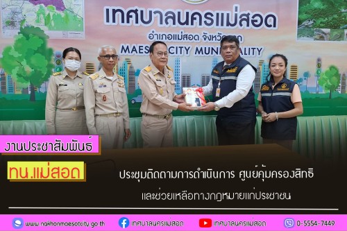 ว่าที่ร้อยตรี ประเสริฐ ปวงละคร นายกเทศมนตรีนครแม่สอด มอบหมายให้ นายไกรสร กิจการ รองนายกเทศมนตรี พร้อมด้วยเจ้าหน้าที่สำนักปลัด ฝ่ายนิติการ และเจ้าหน้าที่ที่เกี่ยวข้อง ร่วมต้อนรับคณะจากสำนักงานอัยการคุ้มครองสิทธิ และช่วยเหลือทางกฎหมายและบังคับคดีจังหวัดตาก (สาขาแม่สอด) เพื่อประชุมติดตามการดำเนินงานของศูนย์คุ้มครองสิทธิและช่วยเหลือทางกฎหมายแก่ประชาชนประจำเทศบาลนครแมสอด เพื่อรับฟังความคิดเห็น ติดตามผลการดำเนินการและให้บริการประชาชนในชุมชนตามบทบาทภารกิจหน้าที่
