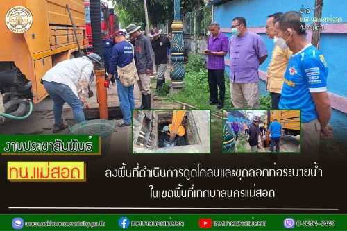 ว่าที่ร้อยตรี ประเสริฐ ปวงละคร นายกเทศมนตรีนครแม่สอด มอบหมายให้ นายไกรสร กิจการ รองนายกเทศมนตรีเทศบาลนครแม่สอด นายประสาน มั่นมาก รองปลัดเทศบาลนครแม่สอด สมาชิกสภาเทศบาล กองช่างสุขาภิบาล และเจ้าหน้าที่ที่เกี่ยวข้อง ลงพื้นที่ดำเนินการดูดโคลนและขุดลอกท่อระบายน้ำ ในเขตพื้นที่เทศบาลนครแม่สอด บริเวณถนนข้างโรงเรียนเทศบาลวัดชุมพลคีรี ชุมชนชุมพลพัฒนา