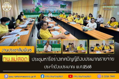 ว่าที่ร้อยตรี ประเสริฐ ปวงละคร นายกเทศมนตรีนครแม่สอด พร้อมด้วยคณะผู้บริหาร หัวหน้าส่วนราชการ และเจ้าหน้าที่ที่เกี่ยวข้อง ประชุมหารือร่างเทศบัญญัติงบประมาณรายจ่ายประจำปีงบประมาณ พ.ศ.2568 เพื่อให้การจัดทำร่างเทศบัญญัติงบประมาณรายจ่ายประจำปีงบประมาณ พ.ศ.2568 สอดคล้องกับแนวทางการจัดทำงบประมาณรายจ่ายประจำปีงบประมาณ พ.ศ.2568 ตามระเบียบฯ และหนังสือสั่งการที่เกี่ยวข้อง